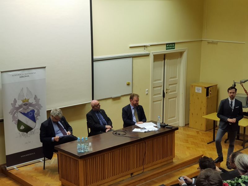 W ostatni czwartek października zorganizowaliśmy kolejny arkoński wykład otwarty, tym razem w murach Politechniki Warszawskiej. Poruszyliśmy temat bardzo gorący w ostatnich miesiącach – reformy szkolnictwa wyższego. Zaproszenie do zabrania głosu w debacie Studia przyszłości przyjęli podsekretarz stanu w MNiSW, filister Arkonii Łukasz Szumowski (cetus 1993), JM rektor PW prof. Jan Szmidt oraz dyrektor Narodowej Agencji Wymiany Akademickiej, filister Arkonii Łukasz Wojdyga (cetus 1997). Dzięki zacnym gościom mieliśmy wyjątkową okazję zasięgnąć informacji o powstającej ustawie bezpośrednio u źródła – zarówno ze strony rządowej, jak i akademickiej. Temat budzi żywe zainteresowanie, gdyż dotyczy bezpośrednio nas wszystkich – młodzież akademicką. Spotkanie przebiegło w miłej atmosferze. Paneliści przedstawili racje i potrzeby każdej ze stron zainteresowanych reformą. Po dyskusji prelegentów nadszedł czas na pytania z Sali, a po nich miły czas spędzony w kuluarach, gdzie paneliści i słuchacze mogli długo dyskutować na interesujące tematy. Spotkanie zostało zorganizowane we współpracy z Samorządem Studentów Politechniki Warszawskiej.
