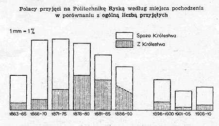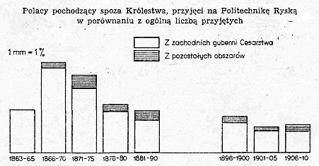 Tak więc w miarę jak pod koniec XIX w. zwiększały się możliwości studiów technicznych, rolniczych i handlowych w Królestwie i w Galicji i w miarę jak umacniały się akademickie kontakty tych dwóch obszarów, słabły związki Politechniki Ryskiej z Królestwem, tym bardziej ze w ostatnim dziesięcioleciu XIX w. zaczęto także w Rydze wprowadzać ograniczenia przyjmowania Polaków (katolików) na studia 23. Jeszcze bardziej wyraźne stały się te proporcje w dobie rewolucji 1905-1907 zmuszającej licznych do opuszczenia zaboru rosyjskiego ze względów pozanaukowych. Politechnika Ryska coraz bardziej zamykała swe oddziaływanie w kręgu guberni nadbałtyckich.